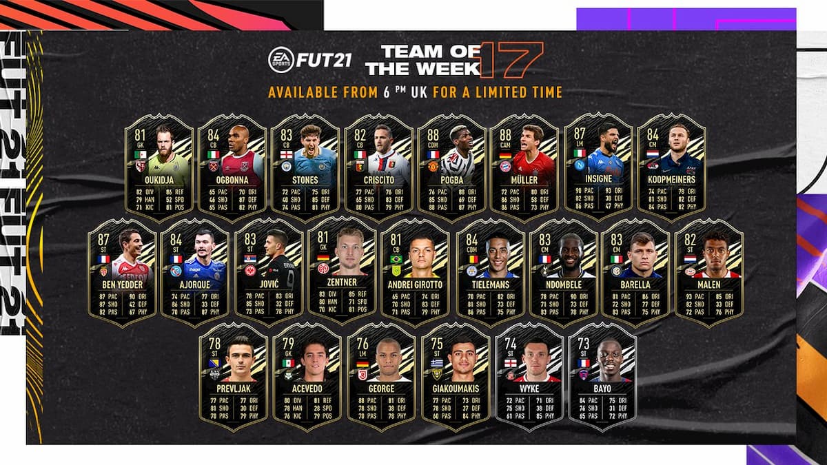 Among all players from the seventeenth Team of the Week, Pogba (88 OVR) is tied with Muller for the highest-rated card from this week’s dump of new cards. Other notable names from this week’s Team of the Week include Napoli left midfielder Ciro Insigne (87 OVR) and AS Monaco striker Wissam Ben Yedder (87 OVR).