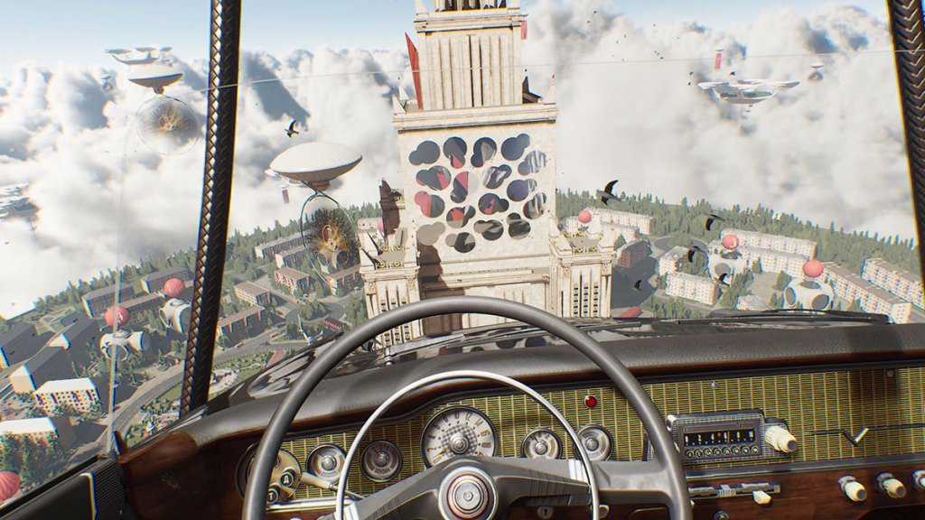What starts as linear game design explodes into an immersive sim that presents you with an Atomic Heart-themed buffet to stuff yourself in. The first time you see the vastness of this open world, it’s almost too much. Each building where main missions take place has a set layout you become familiar with after a while. They’re enjoyable to explore and battle through, feeling more akin to regions in Rapture. The open world is a slice of land that’s connected by roads, forests, and paths. You can run everywhere on foot, sneaking around cameras and killing robots where required, or use a car to reach your next goal. The noise of the car draws a lot more attention than you might like, so you need to become proficient at escaping large groups of enemies in case you hit a giant robot and need to dive out the passenger door. Unfortunately, the world does begin to fall apart towards the last 15% of the game due to graphical issues. These are fairly minor, though, and can be overlooked at the time because they’re an aside to something else taking the spotlight in the scene.