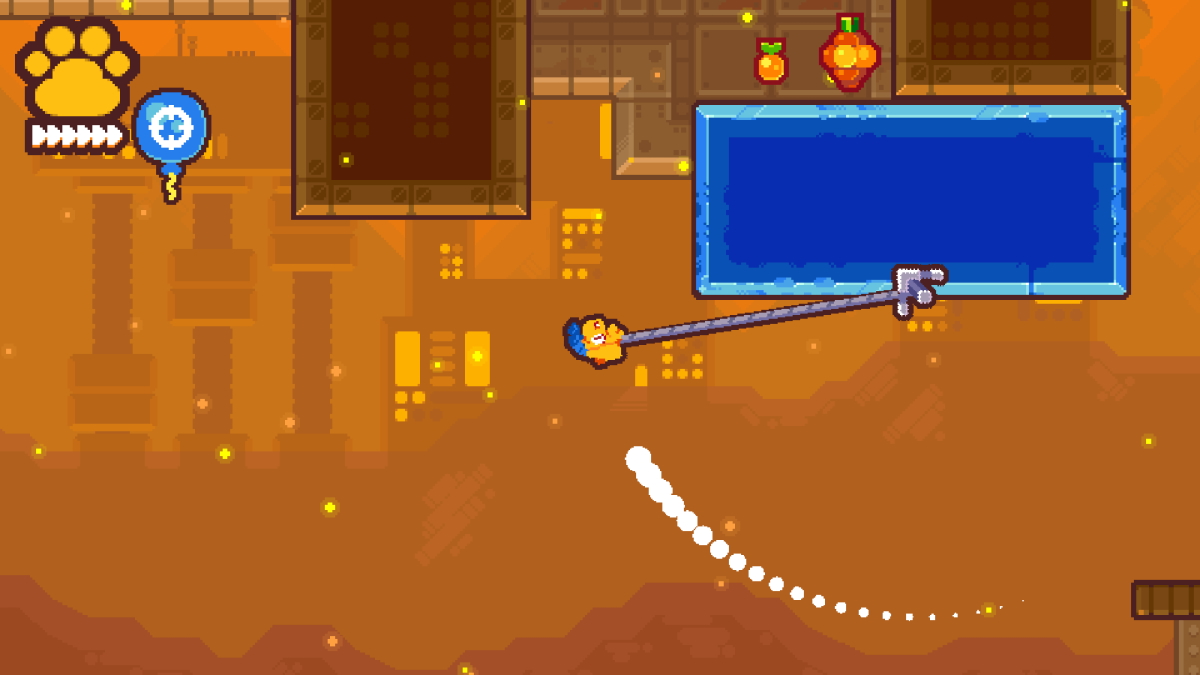 The meat of the gameplay revolves around the grapple gun that Pablo picks up very early on in the story. Combined with a modest selection of other platforming staples — you can jump, do a ground pound, wall-jump, that sort of thing — it’s the main method of traversal in the game. As a general rule of thumb, anything blue can be grappled from. This includes stationary blocks, poppable balloons that give you a boost, and moving grapple points on conveyor belts in later levels. There’s a fairly robust simulation of momentum physics implemented when hanging from things, too, which will help you leap further and jump higher, though it does admittedly take a bit of getting used to. Occasionally you may find yourself pinging across the screen at high speed after swinging from a grapple point, which can make the precise platforming sections trickier unless you take it slower and steadier.